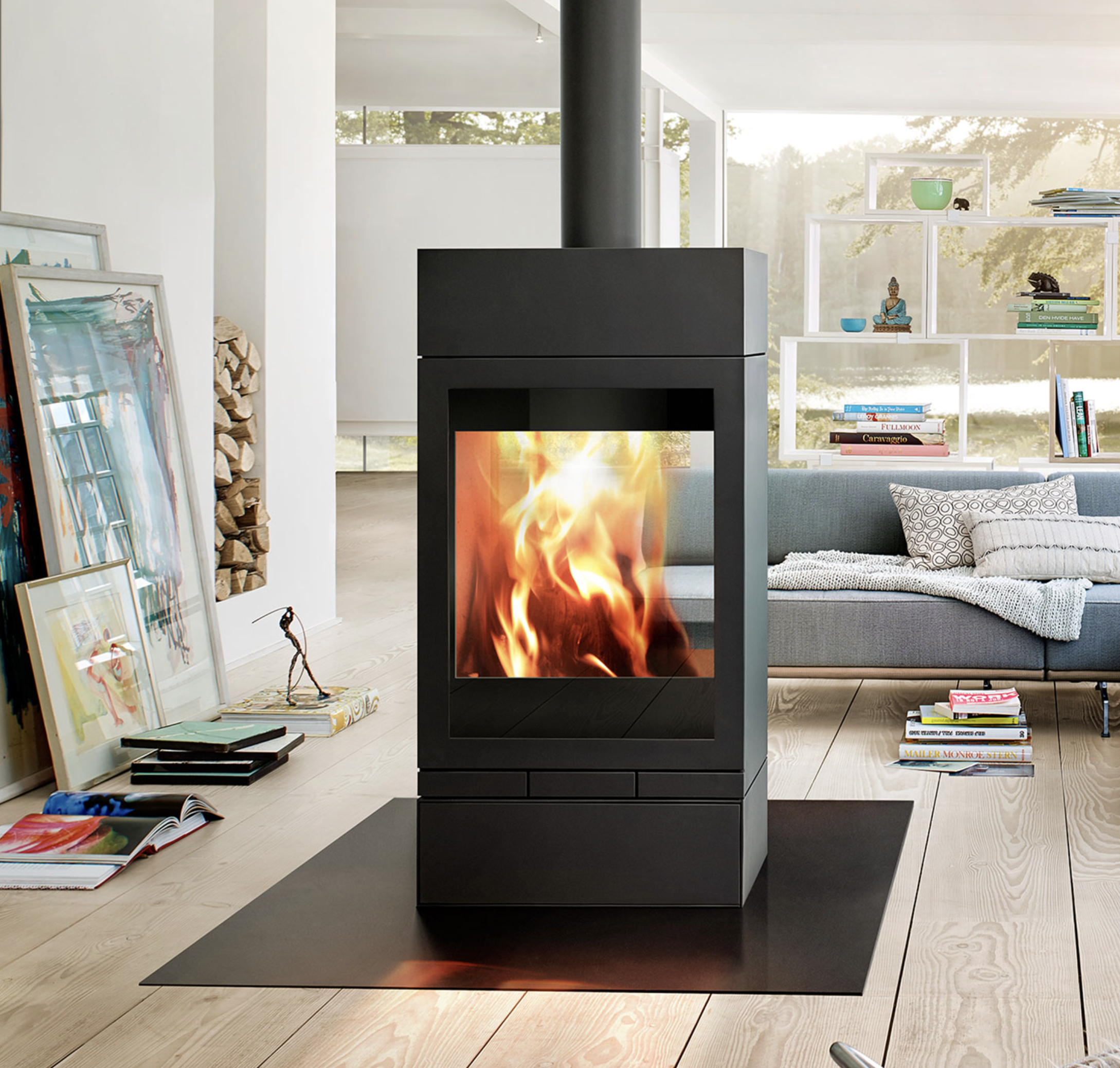 Installé dans un grand espace ouvert, il devient un élément de liaison entre les zones de vie. Dans un loft ou une maison moderne, il s’impose comme une pièce de design, aussi belle éteinte qu’en fonctionnement.